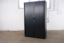 Zwarte roldeurkast van het merk ASPA, ideaal voor het ordenen van je kantoorbenodigdheden. De kast heeft een hoogte van 195 cm en een breedte van 120 cm, met vier stevige legborden voor optimaal opbergruimte. De kast wordt standaard geleverd zonder sleutel, maar deze is op aanvraag bij te bestellen. Perfect voor het creëren van een opgeruimde en georganiseerde werkruimte.