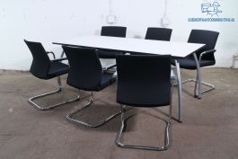 Deze tweedehands Assenburg vergadertafel biedt een representatieve en praktische oplossing voor iedere vergaderruimte. Het licht ahorn tafelblad geeft een frisse, moderne uitstraling, terwijl het strakke grijze designframe zorgt voor stabiliteit en een professionele look.