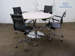 Deze tweedehands bijzettafel is een stijlvolle en veelzijdige toevoeging aan wachtruimtes of woonkamers. Het strakke chroom frame en compacte formaat maken de tafel functioneel zonder veel ruimte in te nemen. Het tafelblad is aanpasbaar in kleur en materiaal, zodat u het geheel kunt afstemmen op uw interieur.