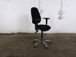 U kunt prettig werken in deze tweedehands bureaustoel. De stoel is zwart gestoffeerd voorzien van een chromen onderstel met zwarte verstelbare armleggers. De stoel is verrijdbaar en heeft een verstelbare rugleuning.