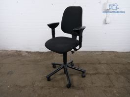 Deze tweedehands bureaustoel is volledig zwart van kleur. Zowel de armleuningen als de totale hoogte van de stoel zijn in hoogte verstelbaar.
