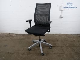 Deze tweedehands stoel is voorzien van een zwart gestoffeerde zitting en een mesh rugleuning, met daaronder een zilvergrijs onderstel. De stoel is kantelbaar, in hoogte verstelbaar en de armleuningen zijn 3D verstelbaar.