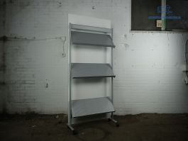 In deze folderdisplay kunt u mooi uw folders presenteren. De folderdisplay heeft 3 geperforeerde legborden, zilvergrijs van kleur en achterpaneel is wit. Deze tweedehands folderdisplay is verrijdbaar en verkeert in zeer nette staat. De afmetingen zijn 188 cm hoog, 90 cm breed en 36 cm diep.