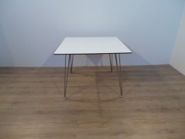 U kunt prettig zitten aan deze tweedehands vierkante Fritz Hansen design tafel. De tafel is voorzien van een wit volkern blad op een chromen spinpoot frame. De afmetingen van deze gebruikte tijdloos design tafel zijn 75 cm hoog, 100 cm breed en 100 cm diep.