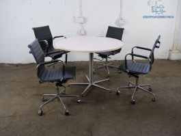 Dit gebruikte bijzettafeltje/ salontafeltje van Fritz Hanssen kunt u mooi gebruiken in de wachtruimte als lectuurtafel. Maar ook in huis zal hij zeker niet misstaan. U kunt zelf voor de kleur van het blad kiezen uit onze grote assortiment (let op een lange levertijd), het rust op een design geborsteld RVS frame. Dit tweedehands bijzettafeltje heeft een hoogte van 75 cm en diameter van 100cm. Let op: het ahorn blad op de foto is een show model.