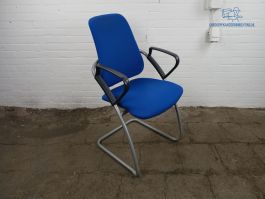 Met deze nette tweedehands vergaderstoel van het merk Interstuhl kunt u fijn overleg voeren met uw collega's! De gebruikte vergaderstoel heeft een blauw gestoffeerde zitting en rugleuning en een zilvergrijs sledeframe. Deze stoel is ook uitgevoerd met zwarte armleuningen en is stapelbaar. De stoel verkeert in prima staat.