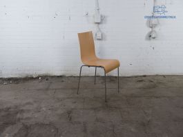 U zit prettig te pauzeren op deze tweedehands kantinestoel. Deze gebruikte stoel heeft een kuip van eiken hout met een verchroomd onderstel. Deze tweedehands kantinestoel is ook eens stapelbaar en verkeert in nette staat.