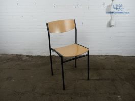 Deze tweedehands houten kantinestoelen zijn voorzien van een beuken zitting en rugleuning. Het frame van de stoel is zwart.