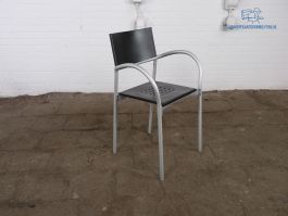 U kunt prettig tot rust komen op deze nette tweedehands kantinestoel. De zitting en de rugleuning zijn beide zwart van kleur en het frame van deze gebruikte stoel is zilvergrijs.