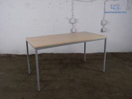 Deze tweedehands kantinetafel is voorzien van een ahorn blad, die 160 cm breed en 80 cm diep is. Het blad rust op een zilvergrijs frame.