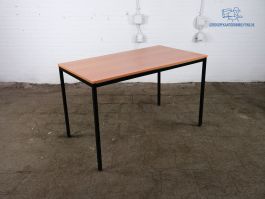 Deze tweedehands kantinetafel is voorzien van een kersen blad op een zwart frame. De afmetingen zijn 120 cm breed, 80 cm diep en 76 cm hoog.