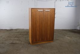 U kunt uw overige spullen kwijt in deze tweedehands klapdeurkast. Deze kast bestaat uit notenhout, is voorzien van klapdeuren met daarop zilvergrijze details. Deze kast is voorzien van 2 legborden. De afmetingen zijn 117,5 cm hoog, 80 cm breed en 36 cm diep. Dit gebruikte kastje is erg netjes, echter zijn er onderom wel wat beschadigingen te vinden.