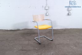 Comfortabele Vergaderstoel – Donkergeel Gestoffeerd, Berken Rug, Grijs Sledeframe, Tweedehands