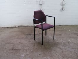 In deze tweedehands vergaderstoel van het merk Lande, kunt u prima zitten tijdens een vergadering op kantoor. Deze gebruikte stoel is bordeaux rood gestoffeerd met een zwart frame daaronder. De stoel heeft armleuningen en is stapelbaar. Verder verkeert deze tweedehands vergaderstoel in nette staat.