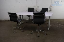 Vergader in stijl en comfort met deze tweedehands vergadertafel van het gerenommeerde merk Lensvelt. Het minimalistische design en de functionele afmetingen maken deze tafel ideaal voor zowel kleine als grotere vergaderruimtes, kantoren of gezamenlijke werkplekken. Het tijdloze grijs zorgt ervoor dat de tafel gemakkelijk in diverse interieurstijlen past.