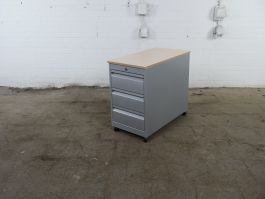 In dit tweedehands Mibra ladeblok kunt u uw spullen netjes opruimen. Het ladeblok is zilvergrijs van kleur met een ahorn topblad daarop. Dit gebruikte ladeblok is voorzien van 3 lades. De afmetingen zijn 62 cm hoog, 42 cm diep en 80 cm diep. Standaard wordt dit ladeblok geleverd zonder sleutel, deze kunnen wij natuurlijk wel voor u bij bestellen.