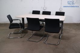 Deze zo goed als nieuwe vergadertafel van Palmberg biedt een stijlvolle en solide basis voor elke professionele werkomgeving. Het natuurgetrouwe eiken blad zorgt voor een warme, tijdloze uitstraling, terwijl het grijze T-poot frame stevigheid en stabiliteit combineert met een moderne, ingetogen look. Dankzij de handmatige hoogteverstelling kan de tafel eenvoudig worden aangepast aan verschillende gebruikssituaties – ideaal voor overleg, teamwork of flexibele werkplekken.