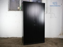 In deze tweedehands roldeurkast kunt u netjes en veilig uw spullen opbergen. De kast is zwart van kleur en is voorzien van 4 legborden. De afmetingen van deze gebruikte kast zijn 196 cm hoog, 120 cm breed en 45 cm diep. Deze roldeurkast heeft wel gebruikssporen. Standaard wordt de roldeurkast geleverd zonder sleutel, deze kunnen we natuurlijk wel voor u bijbestellen.