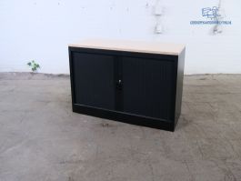 U kunt uw spullen netjes en veilig opbergen in deze tweedehands roldeurkast. De gebruikte kast is zwart van kleur met een ahorn topblad erop en voorzien van 1 legbord. De afmetingen zijn 72 cm hoog, 120 cm breed en 45 cm diep. De kast wordt standaard geleverd zonder sleutel, deze kunnen we uiteraard wel voor u bij bestellen.
