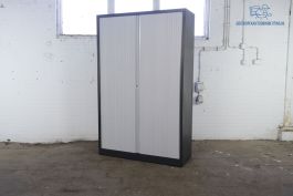 Deze tweedehands roldeurkast combineert een strak design met praktische opbergruimte. De zwarte metalen kast met grijze lamellen past moeiteloos in elke kantoorruimte en biedt volop mogelijkheden om documenten en materialen overzichtelijk te ordenen.