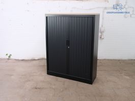 In deze tweedehands roldeurkast kunt u netjes en veilig uw spullen opbergen. De kast is zwart van kleur met een robson eiken topblad daarop en is voorzien van 2 zwarte legborden. De afmetingen van deze kast zijn 137.5 cm hoog, 120 cm breed en 43 cm diep. Deze gebruikte roldeurkast wordt standaard geleverd zonder sleutel, deze kunnen we eventueel wel voor u bij bestellen.