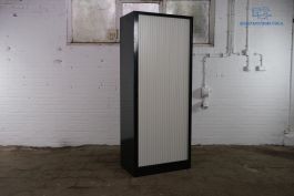 In deze tweedehands roldeurkast kunt u netjes uw spullen opruimen. De kast is zwart van kleur, de deuren en legborden zijn lichtgrijs. De kast is voorzien van 4 legborden. De afmetingen van deze gebruikte kast zijn 195 cm hoog, 80,5 cm breed en 48 cm diep. Deze kast wordt standaard zonder sleutel geleverd, maar uiteraard kunnen we deze wel voor u bijbestellen.