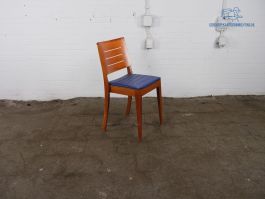 Satelliet | Kantinestoel | Tweedehands | Kersen hout | Blauwe zitting | Stapelbaar | KS248