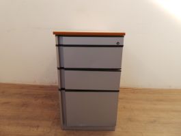 In deze tweedehands standcontainer kun u netjes uw spullen opbergen. De standcontainer is grijs van kleur met een beuken topblad. Hij is voorzien van 4 lades waarvan één pennenlade en één archieflade. De afmetingen zijn 74 cm hoog, 43 cm breed en 80 cm diep. Standaard wordt deze standcontainer geleverd zonder sleutel. Deze kunnen wij wel voor u bij bestellen.