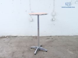 Deze tweedehands bijzet- of statafel is een stijlvolle en praktische aanvulling voor kantoor, wachtruimte of thuis. Het houten blad geeft een warme, natuurlijke uitstraling, terwijl het zilvergrijze kruispoot voor een stabiele en moderne basis zorgt. Het compacte formaat maakt de tafel ideaal voor informele overleggen, recepties of als praktische aanvulling in verschillende ruimtes.