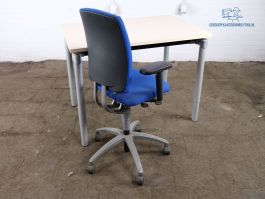 Handige kleine tweedehands werkplek van slechts 120 cm breed en 80 cm diep. Dit gebruikte bureau heeft een vierpoots lichtgrijs frame en is handmatig te verstellen. Dit bureau is voorzien van een ahorn blad en verkeert in goede staat.