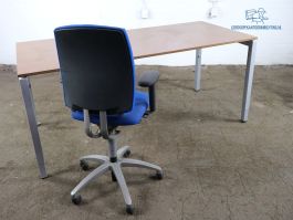 Nette tweedehands werkplek van 200 cm breed en 90 cm diep. Dit gebruikte bureau heeft een vierpoots zilvergrijs frame en is handmatig te verstellen. Dit bureau is voorzien van een notenhout blad.