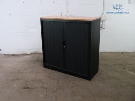 U kunt uw spullen netjes opruimen in deze nette tweedehands roldeurkast. Deze kast is zwart van kleur, met een beuken topblad. De gebruikte kast heeft 2 legborden . De afmetingen van deze gebruikte kast zijn 105 cm hoog, 120 cm breed en 45 cm diep. Deze kast wordt standaard zonder sleutel geleverd, maar we kunnen deze altijd voor u bijbestellen!
