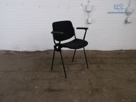U zit comfortabel in deze tweedehands vergaderstoel. De stoel is voorzien van een zwart gestoffeerde zitting en rug op een zwart frame met zwarte armleggers. Deze gebruikte vergaderstoel is niet stapelbaar en verkeert in goede staat.