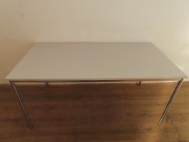 Aan deze tweedehands vergadertafel kunt u goed overleg voeren. De tafel is voorzien van een lichtgrijs blad op een chromen frame. De afmetingen van deze gebruikte vergadertafel zijn 75 cm hoog, 160 cm breed en 80 cm diep.