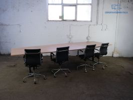 Deze royale tweedehands vergadertafel biedt een ruime plek voor ongeveer 10-12 personen om overleg te voeren. De tafel is namelijk 400 cm breed en 150 cm diep (aan het einde is het 120 cm diep) de hoogte van de tafel is handmatig verstelbaar. De tafel heeft een tonvormig havanna blad met daaronder een zwart frame. Deze gebruikte vergadertafel verkeert in nette staat.