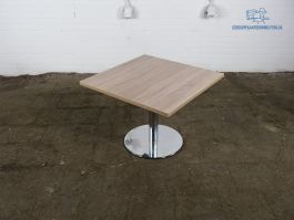 Deze tweedehands bijzettafel is voorzien van een vierkant robson eiken blad, van 80x80 cm. De tafel heeft een ronde verchroomde poot en een totale hoogte van 51 cm.